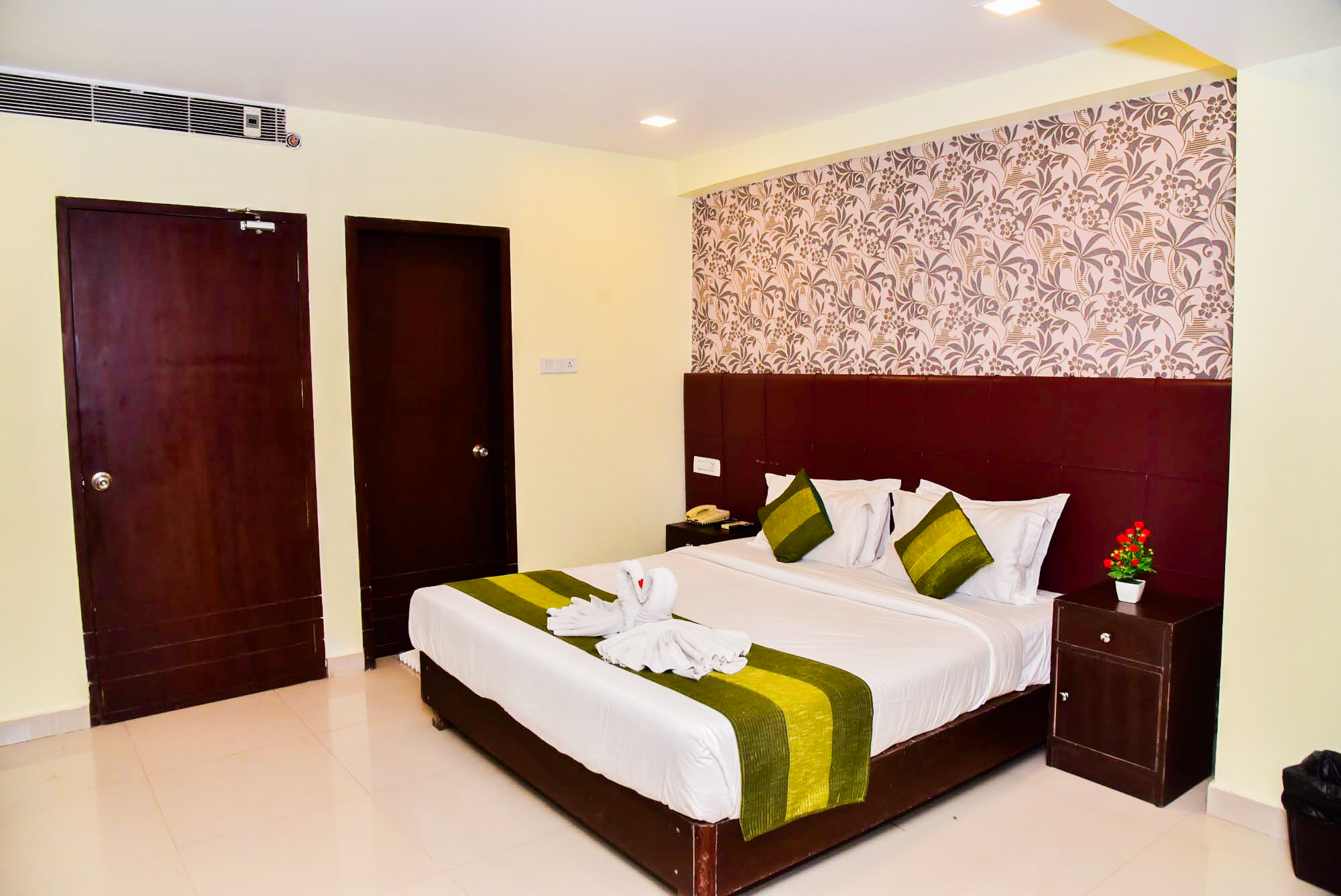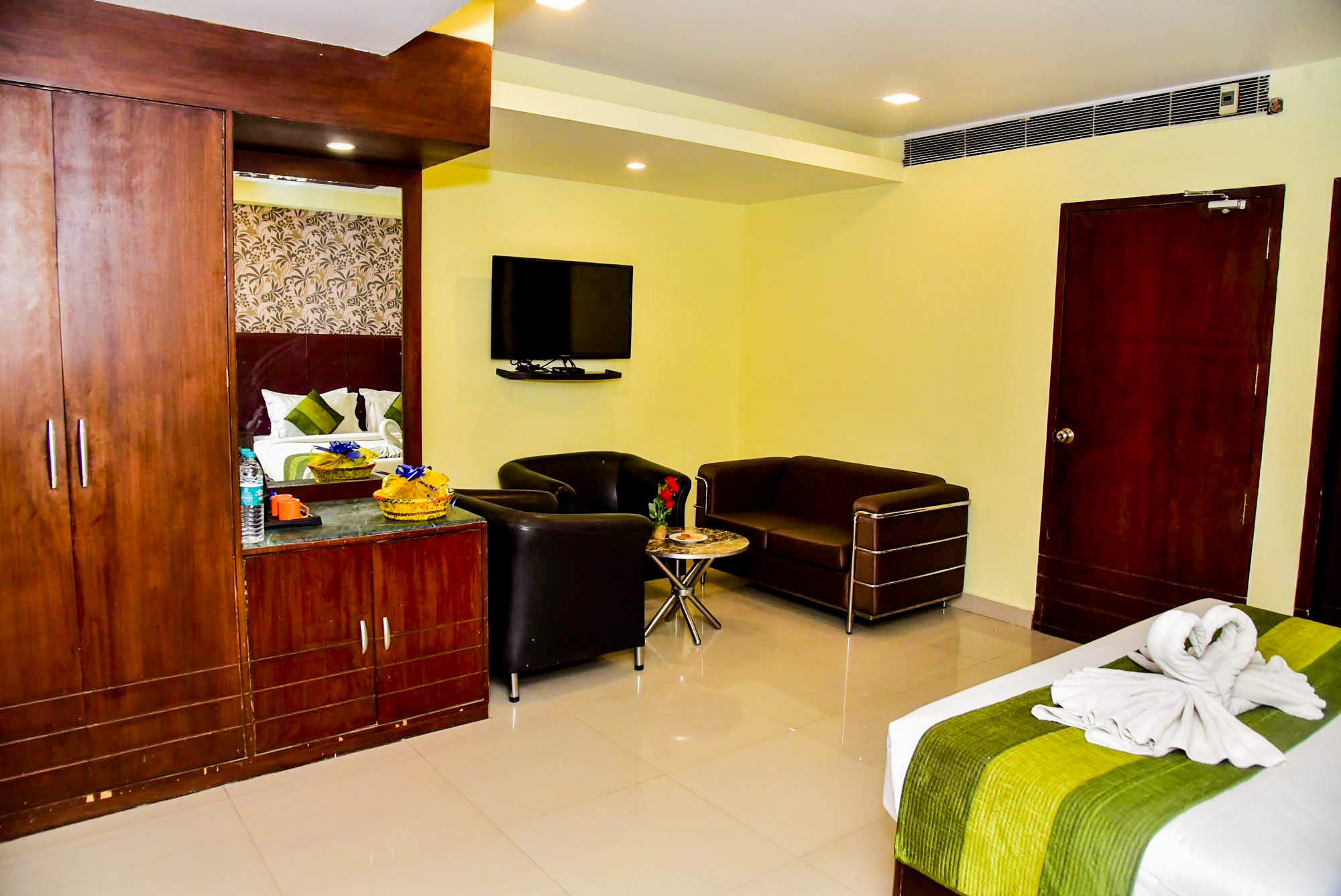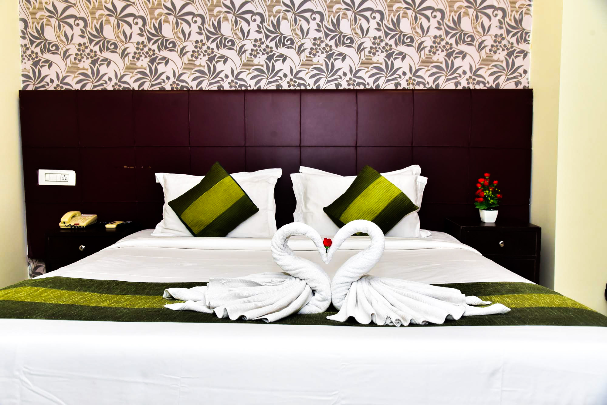 Experience luxury in Nirvana Deluxe Rooms, perfect for couples or families, accommodating 4 guests. Air-conditioned, ensuite, TV, mini-fridge, Wi-Fi, and private balcony with scenic views. Near Patna Junction, enjoy chocolates, bathrobes, and serene ambiance. Features include an executive desk, mini-bar, Simmons mattress, and blackout curtains for a premium stay.